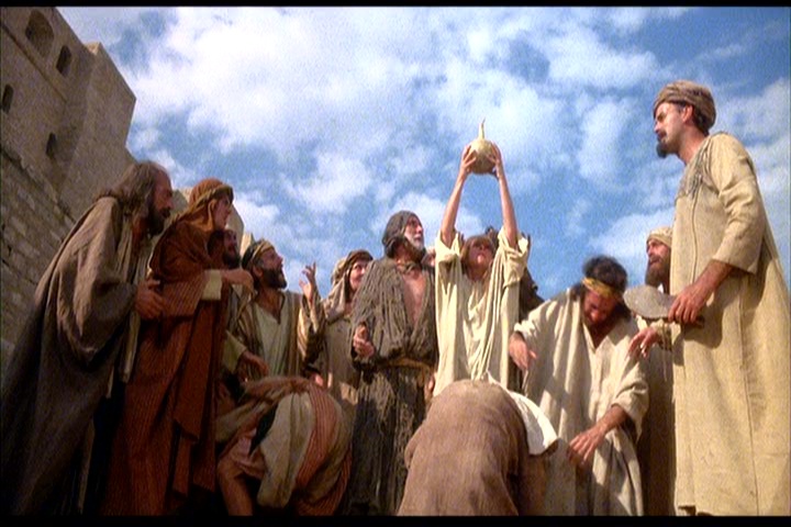 Ácido como de costume, o roteiro de Chapman e Cleese aborda de forma inteligente temas polêmicos, como na hilária cena da sandália e da cabaça que satiriza a divisão de igrejas que teoricamente se baseiam na mesma fé, seguida pelo falso milagre da árvore no deserto, criticando também o fanatismo religioso na ótima cena do apedrejamento, na qual eles acusam de blasfêmia qualquer simples menção ao nome sagrado e, finalmente, ilustrando como as inúmeras divisões dentro do povo judeu (que teoricamente lutava pelo mesmo objetivo, mas na prática lutava entre si) deixavam de lado a causa do movimento e priorizavam o poder.