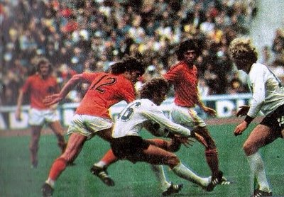“Aonde existir um favorito absoluto, sempre existirá a Alemanha para derrotá-lo”. Este parece ser um lema quase sempre obedecido pelo futebol em Copas. É injusto dizer que os alemães não sabem jogar futebol. Sabem e muito, e os números provam isto. Mas quase sempre são considerados azarões, porque seu futebol raramente é vistoso, ainda que tenha grandes craques em sua história, como Beckenbauer, Mathäus e Klinsmann, pra ficar entre os mais recentes. Em 54 venceram a espetacular Hungria. Em 74 não foi diferente. Nem mesmo com o inicio extraordinário da Holanda liderada por Cruyff, que arrancou da intermediaria com um minuto de jogo, sem que os donos da casa tocassem na bola, para sofrer o pênalti que ele mesmo converteria em 1×0. Mas o gol parece ter adormecido o excepcional time holandês, que assistiu os fortes germânicos virarem o jogo com dois gols do mega artilheiro Gerd Müller (maior artilheiro das Copas até 2006, quando Ronaldo superou sua marca). Muito interessante ver Beckenbauer desfilar em campo com todo seu talento e ver como mesmo sendo superior tecnicamente, a Holanda caiu frente à organização e força alemã.