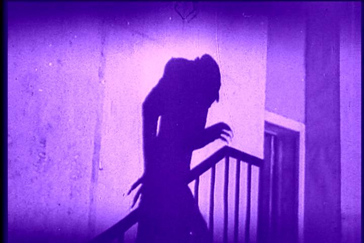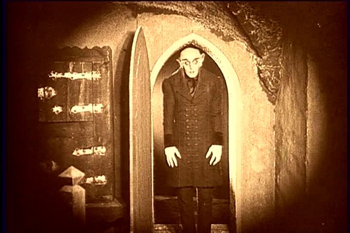 Como podemos perceber, basta trocar os nomes dos personagens para identificar a tradicional história do Conde Drácula escrita por Bram Stoker. Dirigido por Murnau, o clássico fantasmagórico “Nosferatu, uma sinfonia de horrores” faz uma releitura da famosa história, com nomes trocados e pequenas modificações (o diretor não conseguiu autorização para adaptar a obra de Bram Stoker), criando imagens aterrorizantes sob a forte influência do expressionismo alemão. A atmosfera do filme é fantástica, criando um clima de terror através do belo texto (mérito do roteiro de Henrik Galeen, baseado na obra de Bram Stoker) e da pesada direção de fotografia, que pintou à mão a película do filme, tingindo a tela em tons de azul, amarelo e vermelho em muitas cenas, o que além de ter função narrativa (as cores dividem ambiente externo e interno, além de separar o dia da noite), aumenta o clima fantasmagórico do longa, que mais parece um pesadelo. Também colabora para a atmosfera de horror a bela direção de arte de Albin Grau, que capricha no visual sombrio dos lugares por onde o conde passa, infestando de ratos o navio, por exemplo, e criando um castelo assustador na Transilvânia, com cômodos enormes e um porão tenebroso, onde fica o caixão do vampiro.