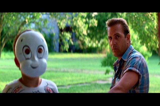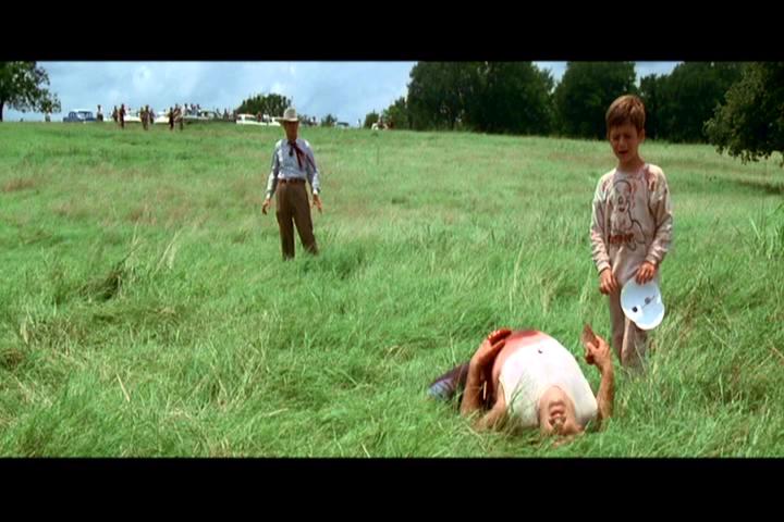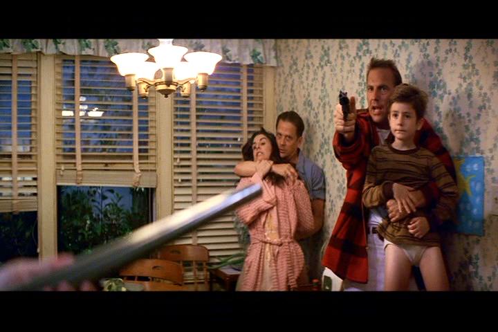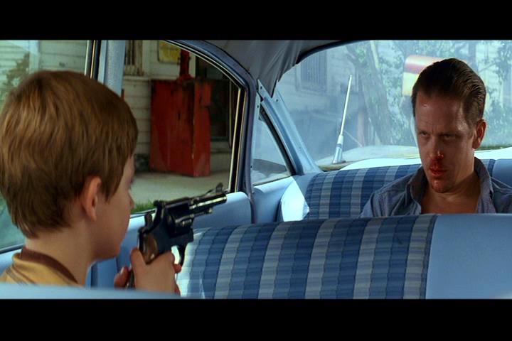 Só que ao contrário do que indica o nome do filme, o mundo não é perfeito. E, obviamente, Butch também não é. E começamos a ter indícios de seu comportamento violento quando ele fica muito bravo ao ver uma mãe maltratando suas crianças (algo que Costner demonstra com o semblante), revelando um lado de sua personalidade que seria vital no clímax da narrativa. E apesar de admirar uma pessoa controlada, como deixa claro ao elogiar Bob por não reagir ao roubo do carro, protegendo a família (“Este é o melhor tipo de pessoa que um homem pode ser”, afirma), ele não conseguirá se controlar ao ver outra criança apanhando. Justamente por isso, a cena na casa do caseiro é essencial para compreender a ambígua personalidade de Butch. Seu lado mais violento vem à tona quando vê pela segunda vez o dono da casa batendo no filho (repare a expressão de ódio de Costner, que explode em cena). Numa síntese de todo o filme, a cena é dominada pelo clima tenso e, ao mesmo tempo, comovente, quando Butch, pacientemente, amarra toda a família para executar o pai, sob o som da música que, momentos antes, embalava a dança suave de todos eles. Neste momento, o espectador se questiona se aquele é o mesmo homem que vimos ensinando tantas coisas legais para Phillip e a resposta vem no diálogo entre ele e a mulher da casa, que afirma que Butch é um homem bom. Sua resposta é emblemática: “Não sou um homem bom, mas também não sou o pior deles”. O trauma da infância fez com que Butch sentisse ódio ao ver um pai agredindo o filho e ele perde os limites, despertando seus piores instintos. Mas, surpreendentemente, Phillip, chorando muito, atira nele e joga a arma num poço, salvando a família.