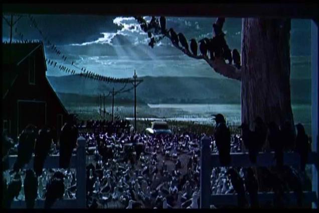 Hitchcock aproveita ainda a paisagem local para criar belos planos, por exemplo, quando Melanie atravessa o rio para chegar à casa de Mitch. Além disso, utiliza a câmera para nos transmitir sensações, como quando Mitch questiona a história do chafariz em Roma, surgindo poderoso na tela ao ser filmado em ângulo baixo, enquanto Melanie aparece intimidada no plano. Além disso, o diretor cria planos aterrorizantes, como aquele que destaca centenas de pássaros nos fios, além de conduzir com precisão cenas marcantes, como quando Lydia visita a casa de Dan, onde a xícara quebrada e um pássaro morto na janela indicam a tragédia, confirmada em seguida, quando vemos aquele homem morto com os olhos arrancados. O diretor é hábil ainda na condução da narrativa, utilizando o interesse de Melanie por Mitch para nos prender durante todo o primeiro ato, distraindo a platéia enquanto prepara a chegada dos grandes vilões. Observe também como no início a fotografia de Robert Burks é mais leve e repleta de cenas diurnas, o que contrasta diretamente com o final sombrio e até mesmo com o segundo ato, onde a fotografia emprega cores mais frias, reforçadas pelos dias nublados e pelo maior número de cenas noturnas quando comparado ao primeiro ato.