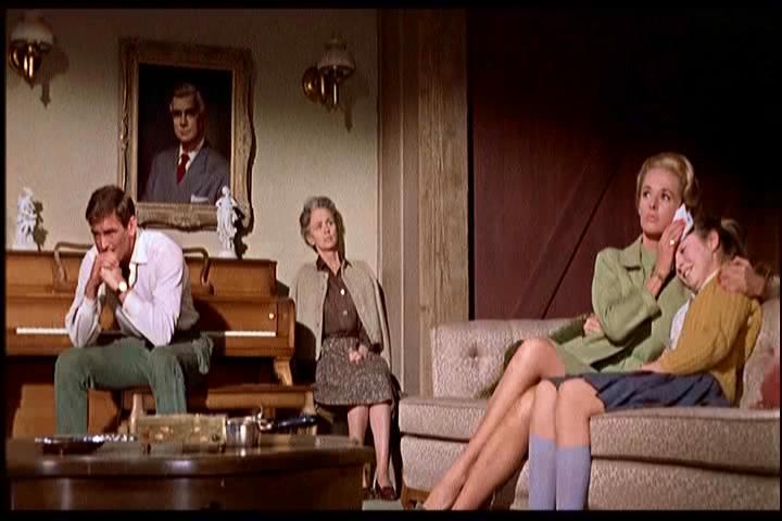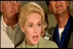 Por outro lado, se o romance entre Mitch e Melanie não empolga é porque Hedren não consegue empatia com Taylor, que até tem uma boa atuação, mas é claramente prejudicado pela companheira. Infelizmente, Tippi Hedren (a loira da vez de Hitchcock) tem uma atuação muito fraca e inexpressiva, representada especialmente nos momentos que exigem tensão, como quando ela reage “assustada” ao incêndio provocado pelos pássaros num posto – numa cena, aliás, muito mal montada por George Tomasini. Ao contrário de Hedren, Suzanne Pleshette se sai bem como Annie, revelando seu ciúme por Mitch numa conversa com Melanie (repare o zoom no rosto dela na hora que Melanie cita o nome dele), evidenciando seu antigo caso com ele. Por isso, quando a professora Annie pergunta se “surgiu algo inesperado” para que Melanie fique na cidade, a tensão do diálogo é notável, já que ambas tem interesse por Mitch, e isto é mérito da boa atuação de Pleshette, como acontece também quando Melanie aceita o convite para a festa de Cathy e Annie balança a cabeça negativamente, evidenciando seu descontentamento – e Hitchcock faz questão de ressaltar a reação dela na cena.
