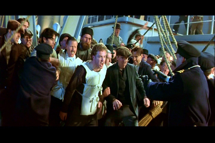 Infelizmente, “Titanic” também tem sua porção de personagens unidimensionais e odiáveis, como o canalha Cal de Billy Zane que, além de atormentar a vida do casal principal, ainda é capaz de usar uma criança abandonada a seu favor no ato final. Já Frances Fisher encarna a Sra. Ruth de maneira tão gélida e impassível que por vezes chegamos a duvidar que ela seja mesmo a mãe de Rose, salvando-se apenas por demonstrar preocupação genuína ao ver a filha voltar para o transatlântico enquanto este afunda e pelo pequeno momento de humanidade quando tenta justificar sua maneira de agir e seu interesse financeiro acima da própria vontade (“Somos mulheres, nossas escolhas nunca foram fáceis”). E finalmente, não posso deixar de mencionar alguns dos oficiais que agem de maneira irracional, segurando a terceira classe já durante o naufrágio e não utilizando toda a capacidade dos botes, chegando ao ápice quando um deles atira num dos amigos de Jack e suicida-se depois, o que ao menos demonstra remorso.