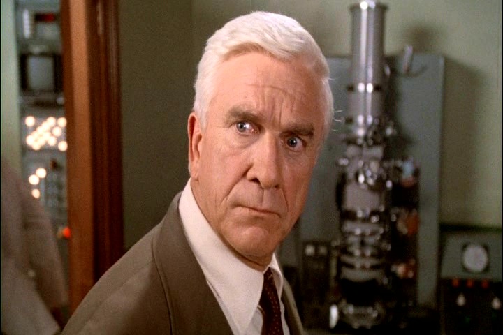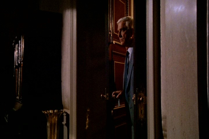 Já famoso pelo sucesso de “Apertem os Cintos… O Piloto Sumiu!”, Nielsen novamente se mostra muito a vontade como protagonista de uma comédia de absurdos, compondo o detetive Drebin como um sujeito sério que não tem a menor noção do que ocorre ao seu redor e que sequer percebe as consequências de seus atos – algo que ele comprova toda vez que estaciona seu carro. Repare, por exemplo, a naturalidade com que ele se pronuncia no engraçado diálogo com a esposa de Nordberg no hospital, diminuindo as esperanças da moça sem piedade e, o que é pior, sem perceber que está fazendo isso. E justamente nesta falta de travas e até mesmo certa inocência que reside o sucesso do personagem.