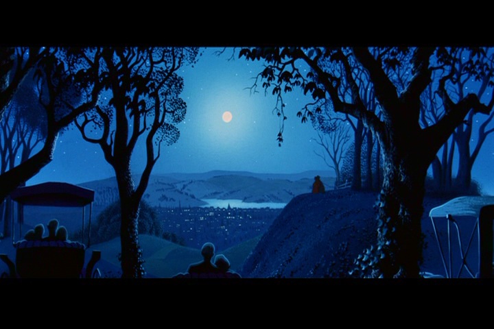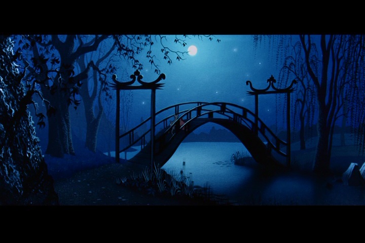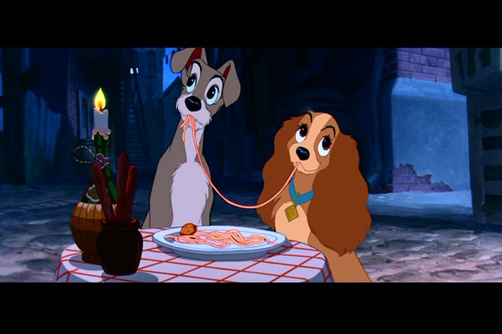 Concentrando boa parte da primeira metade da projeção em Lili, a narrativa nos prepara para o grande encontro do casal, que acontece de maneira casual e nos leva ao lindo passeio noturno deles, repleto de planos memoráveis como aquele em que eles passam por uma ponte e aquele em que vemos toda a cidade iluminada ao fundo. A atmosfera romântica de toda sequência é perfeita e, acompanhada pela linda canção tema (trilha sonora de Oliver Wallace), torna ainda mais especial a icônica cena do jantar em que a Dama e o Vagabundo se beijam. E assim como a divertida transição que indica o crescimento de Lili quando ela dorme na cama dos donos, outra elegante elipse acontece após o jantar e transforma as roupas penduradas no varal nos galhos das árvores durante o passeio. Em seguida, acompanhamos os dois cachorros acordando lado a lado, num instante que sugere sutilmente a conotação sexual do encontro, numa ousadia temática grandiosa para a época, se considerarmos que a “mocinha” criada numa casa de família acabara de dormir na rua com um cachorro sem dono.