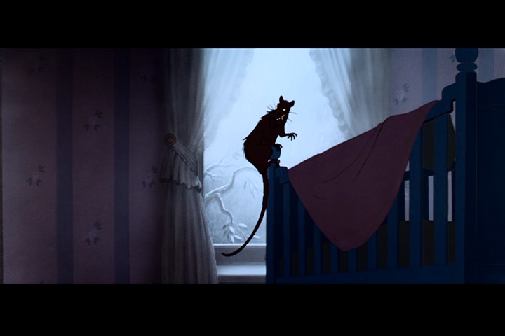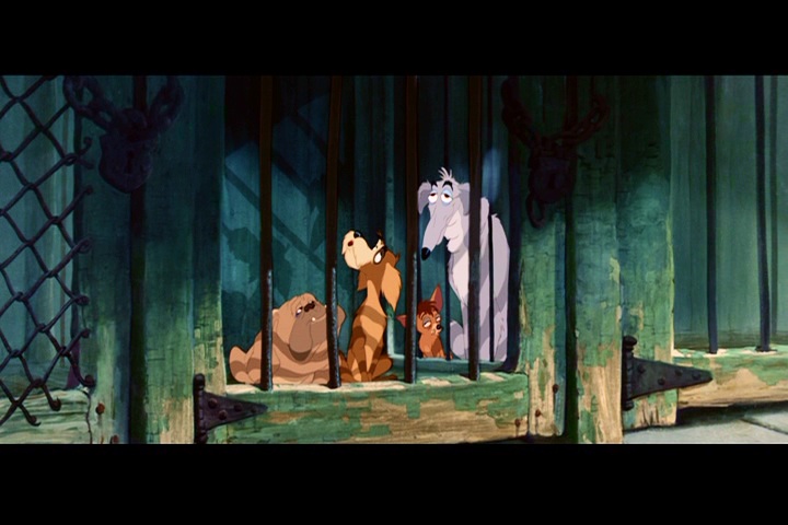 Criando ainda um canil opressor através das paredes velhas e descascadas, que ganha eco no canto melancólico dos cachorros presos, os diretores não hesitam em nos apresentar o trágico destino de um dos prisioneiros, confirmando a ousadia temática que só engrandece o filme ao permitir que o espectador sinta o perigo real que aquele local triste representa. Este visual contrasta diretamente com a primeira metade da projeção, claramente mais viva e colorida, e nos introduz ao ameaçador ato final, carregado pela atmosfera sombria e sufocante após a briga entre a Dama e o Vagabundo que ilustra a apreensão dos personagens com precisão através da chuva e da noite. Este visual requintado chama ainda mais a atenção na batalha entre o Vagabundo e o rato, especialmente no temível plano em que o roedor sobe no berço e é iluminado por um raio, e continua impressionante até o desfecho da empolgante sequência da perseguição à carrocinha, quando o velho Fiel (voz de Bill Baucom) salva o Vagabundo e garante o final feliz. Mas o detalhe mais interessante vem na cena seguinte, quando Lili surge com quatro filhotes e confirma a ousada conotação sexual da noite romântica do casal de maneira sutil.
