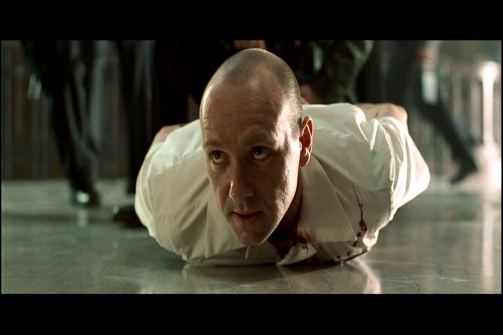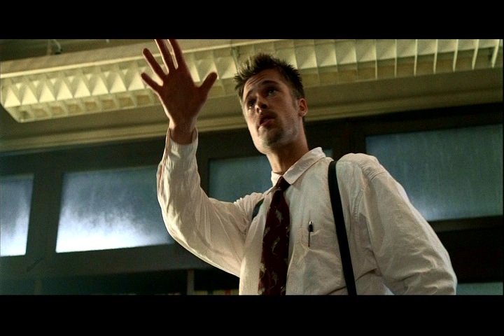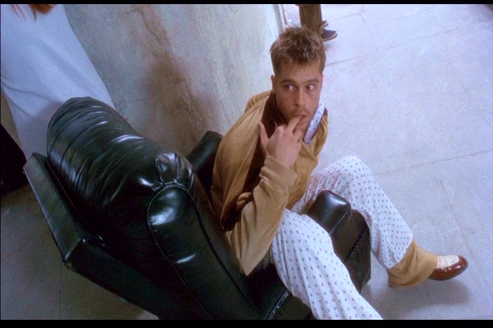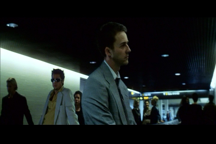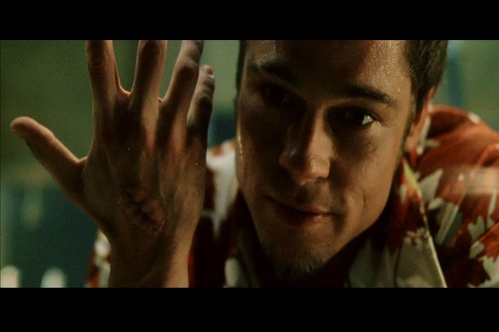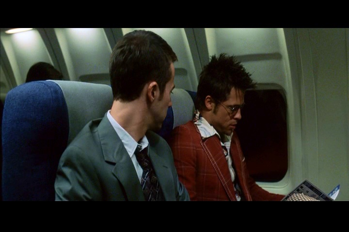 Apesar do choque, a reviravolta de “Clube da Luta” é indicada diversas vezes na narrativa de maneira sutil, seja visualmente, seja através de frases ou momentos vividos pelo narrador (e o próprio fato dele não ter nome já é uma dica em si). Aliás, todo o primeiro ato é trabalhado cuidadosamente para criar o cenário para o surgimento de Durden. Sufocado pelo próprio estilo de vida, o narrador questiona não apenas o próprio consumismo, mas toda a sociedade que o cerca, buscando desesperadamente uma saída. Para simbolizar esta transformação gradual em seu pensamento, Fincher insere quatro flashes rápidos de Tyler até que ele finalmente entre em cena numa conversa trivial dentro de um avião – observe como as malas de ambos são idênticas. Instantes antes, a primeira aparição sem ser em flashes acontece justamente quando o narrador questiona se ao andar por tantos aeroportos e acordar em tantos lugares diferentes ele poderia acordar como uma pessoa diferente um dia – e ele acorda mesmo.
