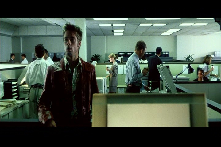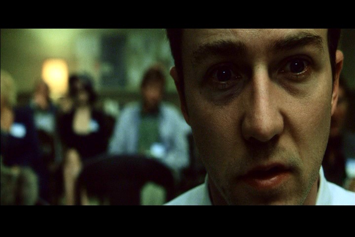 Este estilo de vida sufocante é muito bem refletido pelo narrador interpretado brilhantemente por Edward Norton. Desde o semblante abatido até a voz cansada, Norton compõe o personagem com competência, transmitindo sua falta de forças diante de tudo que o cerca e sua inabilidade para reagir ao que tanto lhe incomoda, sendo incapaz de demonstrar grandes emoções até mesmo quando seu apartamento explode (e compreenderemos isto melhor mais para frente na narrativa). Assim, a ideia da insônia também é interessante, representando muito bem o estado de espirito do personagem (“Quando se tem insônia, você nunca dorme de verdade e nunca acorda de verdade”).
