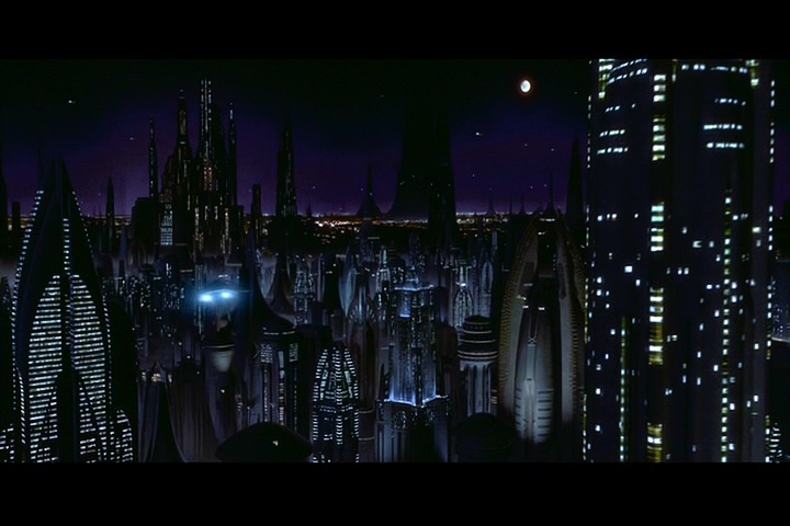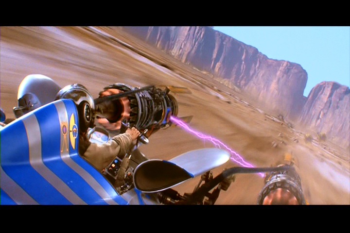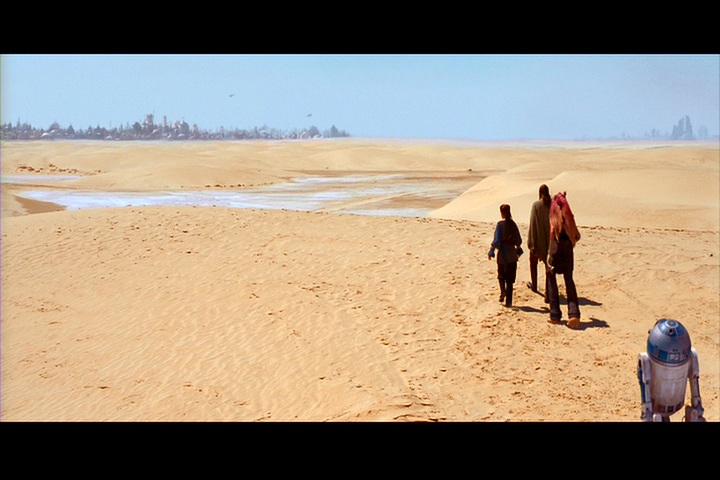 No entanto, se a falta de criatividade do roteiro e a presença de Jar Jar Binks não conseguem arruinar a experiência, muito se deve obviamente à força dos personagens e do universo criado por Lucas nos longas anteriores, mas é inegável também que a qualidade visual de “A Ameaça Fantasma” contribui bastante para salvá-lo. Particularmente preocupado em apresentar ao mundo as maravilhas da ILM, Lucas aproveita todo o aparato tecnológico que tem a disposição para explorar os planetas imaginados pelo design de produção de Gavin Bocquet e que ganham vida com os excepcionais efeitos visuais, nos transportando para aqueles locais e criando sequências visualmente marcantes, que chamam a atenção também pelo contraste entre os tons azulados adotados pelo diretor de fotografia David Tattersall no espaço e os tons quentes no senado e no árido planeta Tatooine, que por sua vez destoam do festival de cores que dominam Naboo, graças também aos figurinos escolhidos por Trisha Biggar, que mantém o padrão mais sóbrio na capital, apostando em roupas mais exóticas em Naboo e em roupas mais velhas e desgastadas em Tatooine, demonstrando as diferenças entre eles. Este contraste também se manifesta nas casas simples que dominam o deserto de Tatooine e nos enormes prédios que formam o skyline da capital, refletindo bem as desiguais condições de vida impostas pelo Império e que dão margem para diversas análises sócio-econômicas e políticas da alegoria que “Star Wars” representa.