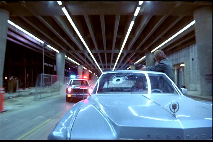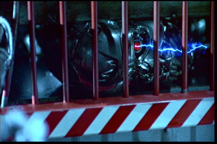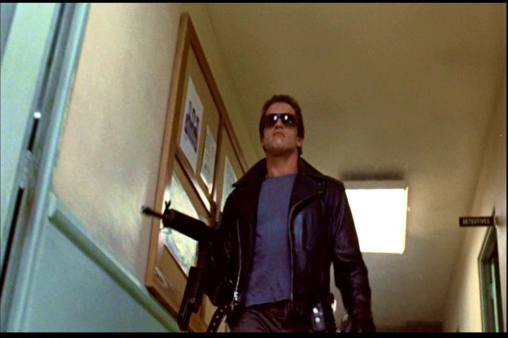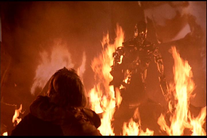 Felizmente, as ótimas cenas de ação de “O Exterminador do Futuro 2” não são a razão de existir do longa, servindo apenas como complemento para uma narrativa bem desenvolvida. E entre tantas cenas marcantes, destaca-se a perseguição do T-1000 num caminhão enquanto John foge numa moto e o exterminador persegue ambos em outra moto, onde a alternância entre os planos confere uma dinâmica interessante à cena, e a seqüência da fuga da Cybernet, que também é carregada de adrenalina. Já a tensa seqüência dentro do hospital psiquiátrico é construída lentamente, nos levando até o magnífico reencontro entre T-800 e Sarah, também conduzido em câmera lenta e seguido pela excepcional fuga do trio num carro em marcha ré. Observe como o som diegético trabalha a favor da cena, colaborando na criação do suspense, intensificado pelas realistas mortes durante a fuga de Sarah, em outro momento inspirado de Hamilton, que demonstra força também nas cenas mais agressivas. E finalmente, o esperado confronto entre os exterminadores fecha com chave de ouro as grandes cenas de ação, quando o tiro certeiro de Sarah encerra a passagem de T-1000 pelo passado – e a triste despedida de T-800, com o polegar levantado para John, chega até mesmo a emocionar, por causa da bela relação que eles desenvolveram.
