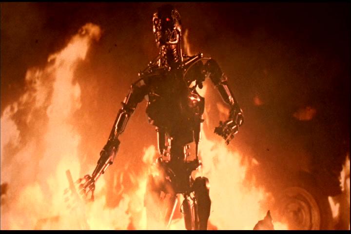 Escrito por James Cameron e William Wisher Jr., “O Exterminador do Futuro 2” suga o espectador pra dentro da narrativa logo em sua introdução, relembrando fatos acontecidos no passado e nos situando na história. Repleto de frases interessantes, como quando T-800 vê duas crianças brincando de trocar tiros e diz que “É da natureza de vocês se destruírem” ou quando Sarah diz para Miles (Joe Morton) que “homens como você fizeram a bomba de hidrogênio”, a principal qualidade do roteiro reside em inverter completamente nossas expectativas ao apresentar o vilão do filme anterior como herói neste segundo filme, algo, aliás, trabalhado cuidadosamente por Cameron para provocar surpresa no espectador. O roteiro ainda desenvolve muito bem os complexos personagens, conseguindo criar uma relação crível entre o andróide e o garoto, além de evidenciar o peso que Sarah carrega por saber da importância que ela e o filho têm na tentativa de evitar um futuro sombrio, dominado pelas máquinas. A frieza daquele mundo visto no primeiro filme, aliás, é mantida pela fotografia azulada de Adam Greenberg nesta seqüência. Por outro lado, Greenberg utiliza cores mais quentes no presente e até mesmo um visual árido no deserto mexicano, que ilustra um futuro tão incerto quanto o daquelas pessoas perdidas em vastos terrenos sem vida. O futuro incerto, aliás, é o tema da franquia, que garante (pelo menos até este segundo filme) que nós escrevemos o próprio destino. A fotografia azulada volta no terceiro ato, reforçando o embate entre os frios exterminadores, mas dá lugar a um visual mais infernal no desfecho da luta entre ambos, que confere ares apocalípticos ao confronto.