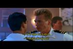 Mas “Top Gun” também tem seus pontos positivos, começando pelo excelente trabalho de som, perceptível principalmente nas sensacionais seqüências aéreas, captando perfeitamente o barulho dos aviões rasgando o céu. A boa montagem de Chris Lebenzon e Billy Weber colabora nestas seqüências empolgantes, onde o diretor Tony Scott cria belos planos, auxiliado também pela direção de fotografia de Jeffrey L. Kimball e pelos efeitos visuais. O diretor abusa do lindo visual durante os vôos, aproveitando o universo de belas imagens que o céu proporciona para filmar de ângulos interessantes como a frente, a asa e a cauda dos aviões. Em outro momento, Scott dá um close em Cruise quando este fala do falecido pai, realçando a tristeza em seu rosto ao pensar na misteriosa morte dele. Tom Cruise, aliás, que tem boa atuação, demonstrando a costumeira energia na pele do rebelde Maverick, apesar de abusar dos intermináveis sorrisos (obviamente, buscando se afirmar como galã). Repare como ele sorri levemente ao ouvir que vai para a escola especial “Top Gun”, pois sabia que aquela era a oportunidade da sua vida de provar a qualidade que tinha como piloto, além de poder enfrentar o passado traumático. Seu desempenho cresce na parte final, após perder o amigo e partir para superar o trauma da perda enigmática de seu pai. Mas infelizmente, o roteiro previsível não exige muito do elenco. Goose, interpretado por Anthony Edwards, é um bonachão infantil que tem a única função de provocar o riso forçado no espectador e a maioria de seus fracos diálogos com Maverick não empolga, como quando falam sobre o Mig invertido. Val Kilmer está caricato e exagerado na pele do unidimensional Tom Kazanski, o “Iceman”, que só tem dois momentos humanos durante toda a narrativa. O primeiro é quando respeita a dor de Maverick por perder o amigo (“Sinto por Goose”) e o segundo é o previsível final, quando finalmente reconhece a qualidade do rival. Kelly McGillis vive a madura Charlotte e tem seus bons momentos, como quando diz para Cruise que não quis deixar a relação entre eles atrapalhar a profissão dela (“Não quero que saibam que me apaixonei por você”). Sua Charlotte, apesar de estar completamente apaixonada, é bastante consciente de que assumir aquela paixão poderia comprometer seu desempenho como instrutora da equipe. Tom Skerritt está excelente como o inteligente comandante Mike “Viper” Metcalf, que sabe muito bem onde Maverick pode chegar e luta para extrair o melhor do garoto. E finalmente, Meg Ryan rouba a cena nos poucos minutos em que aparece, vivendo a esposa de Goose, Carole Bradshaw. Totalmente solta e despojada, é claramente a melhor atuação do longa, transmitindo ainda muita emoção quando perde o marido. É com ela em cena que Goose e Maverick vivem um de seus melhores momentos, quando cantam juntos ao piano.